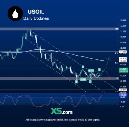 وفي حالة استمرار الزخم الصعودي، يتوقع أن يواجه النفط مقاومة أولى عند 65.70 دولار(R1) ثم مستوى 67.32 دولار(R2)، وهما المستويان الرئيسيان اللذان سيحددان اتجاه السعر المقبل. ومن الناحية الأخرى، في حال فشل السعر في الحفاظ على القناة الصعودية الصغيرة عندD، فقد يشهد تراجعًا نحو الحد السفلي للقناة عند 62.00 دولار تقريبًا، مع اختبار الدعم النفسي عند 61.00 دولار، مما يعكس أن الزخم الهابط لم يتم كسره بعد بشكل كامل.
