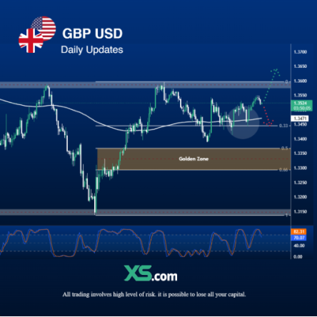 أما على المدى المتوسط، فإن منطقة 1.3450 تمثل نقطة محورية، إذ يتطابق وجودها مع مستوى تصحيح فيبوناتشي 0.33 وارتداد السعر من “Golden Zone”. والثبات أعلاها يبقي الاتجاه الصاعد قائمًا، بينما كسرها سيضعف الزخم الحالي وقد يدفع الزوج نحو مستويات أعمق عند 1.3300–1.3250. لذلك، تظل تحركات الزوج مرهونة بالقدرة على تجاوز المقاومة الرئيسية أو كسر الدعم المحوري.