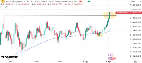 أما في سوق السلع، أسعار النفط بقيت مستقرة نسبيًا، حيث أغلق خام برنت قرب 69 دولار للبرميل مع ميل صعودي محدود بدعم من المخاطر الجيوسياسية بشأن النفط الروسي واستمرار الطلب الأمريكي على الوقود. غير أن العنوان الرئيسي بلا منازع كان الذهب. المعدن الأصفر واصل صعوده اللافت ليتجاوز حاجز 3500 دولار مسجل قمة عند 3546.99 دولار في التداولات المبكرة للجلسة الاسوية. العوامل المحركة لهذا الصعود متعددة كما هي عاده تحركات المعدن الاصفر. ومنها المخاوف التضخمية التي لا تزال موجوده. وايضا أن الأسواق باتت تسعّر بقناعة احتمال خفض الفائدة من جانب الاحتياطي الفيدرالي في اجتماع سبتمبر. ولا ننسى بيانات الوظائف المنتظرة يوم الجمعة تمثل لحظة مهمه، إذ أن قراءة ضعيفة قد تكرس سيناريو التيسير وتفتح الباب أمام قاعده جديدة للذهب، بينما حتى قراءة قوية قد لا تكون كافية لتبديد المخاوف، ما يجعل الذهب يستمر في موقع الصدارة. رابعها أن الضبابية الجيوسياسية، سواء في ملف الرسوم الجمركية أو في النقاش حول استقلالية الفيدرالي، أضافت وقودًا إضافيًا للطلب على الذهب. بالاضافة الى ذلك ان مخاوف اسواق الدخل الثابت التي ذكرها اعلاه تعلب دور في توجه التدفقات الى المعدن الاصفر.