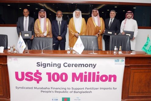 أعلنت المؤسسة الدولية الإسلامية لتمويل التجارة (ITFC)، عضو مجموعة البنك الإسلامي للتنمية (IsDB)، عن توقيع اتفاقية تمويل مرابحة مشتركة مع بنك التصدير والاستيراد السعودي (Saudi Exim) وصندوق أوبك للتنمية الدولية (OPEC Fund)، بقيمة 100 مليون دولار أمريكي لصالح جمهورية بنغلاديش الشعبية، ويأتي هذا التمويل كخطوة بارزة في دعم استراتيجية الأمن الغذائي لبنغلاديش وتعزيز تمويل التجارة البينية في الدول الأعضاء لمنظمة التعاون الإسلامي. وبموجب الاتفاقية، سيتم تمويل مؤسسة التنمية الزراعية في بنغلاديش (BADC) كجهة منفذة لحكومة بنغلاديش، لاستيراد الأسمدة من المملكة العربية السعودية.