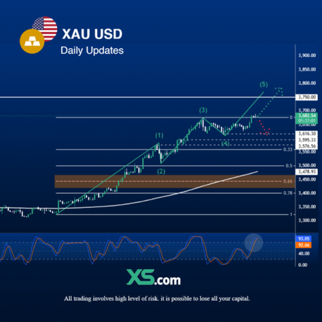 يظهر الرسم البياني لأربع ساعات للذهب/الدولار الأمريكي (XAU/USD) استمرار الزخم الصعودي القوي ضمن هيكل موجات واضح على شكل خمس موجات دافعة، حيث نقترب حاليًا من اكتمال الموجة الخامسة قرب منطقة 3,700 دولار. والسعر يتحرك ضمن قناة صاعدة منذ اختراق مستوى الدعم الرئيسي عند 3,450 دولار (تصحيح فيبوناتشي 0.65)، مما يدل على أن المشترين يسيطرون على السوق على المدى القصير والمتوسط. وبقاء السعر فوق المتوسط المتحرك الرئيسي يعزز هذا السيناريو الصعودي، ويشير إلى إمكانية اختبار قمم جديدة في حال جاء قرار الفيدرالي الأمريكي متوافقًا مع توقعات الأسواق بخفض الفائدة.