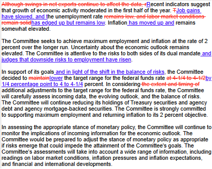 المقارنة بين البيان الحالي والبيانات السابقة تكشف بعض النقاط. التركيز على النشاط الاقتصادي تباطأ ومخاطر التراجع في التوظيف ارتفعت. كذلك ، تم استبدال عبارة الإبقاء على النطاق المستهدف للفائدة بعبارة خفض النطاق المستهدف بمقدار ربع نقطة مئوية. هذه التعديلات، رغم بساطتها الظاهرية، تعكس تحوّل جوهري في تقييم المخاطر وتوجه الفيدرالي لإعطاء أولوية أكبر لجانب التوظيف، حتى وإن كان التضخم لم ينخفض بعد بشكل مقنع.