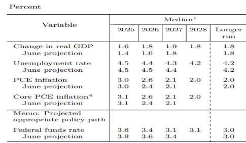 جاءت التوقعات الجديدة للمؤشرات متوافقة مع تخفيض الفائدة. فقد خفضت التقديرات لمعدل الفائدة في 2025 إلى 3.6% مقارنة بـ3.9% في التقديرات السابقة ، ما يشير إلى تصور لخفض إضافي بحوالي 50 نقطة أساس إضافية قبل نهاية العام. في 2026 ، انخفضت التقديرات إلى 3.4% مقابل 3.6% سابقا، بينما بقيت توقعات 2027 عند 3.1% كما هي.
