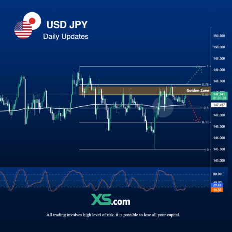 وفي حال نجح الزوج في اختراق”Golden Zone” والإغلاق فوق 148.30 تقريبًا، قد يفتح ذلك المجال لاستهداف مستويات 149.00، وهو المستوى العلوي فيبوناتشي 1.00 الذي يمثل سقفًا تقنيًا مهمًا. ومثل هذا الاختراق سيكون إشارة على عودة السيطرة إلى المشترين ودخول مرحلة صعود قصيرة الأجل.