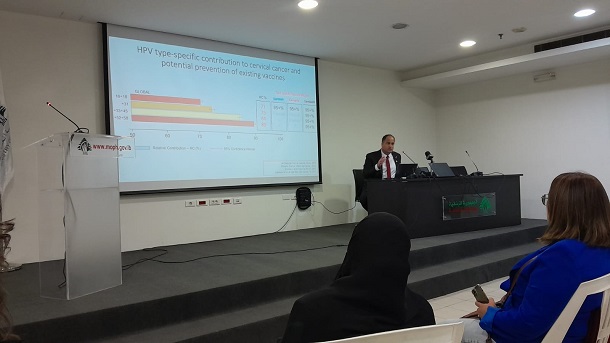 ثم قدم الدكتور ديفيد عطالله عرضًا علميًا شدد فيه على إمكانية تجنّب سرطان عنق الرحم باللقاح والكشف المبكر عن فيروس الورم الحليمي البشري عند الطبيب النسائي.
