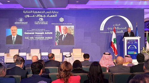 ويشرّفني أن أمثّل في هذا الجمع العربي الكريم، فخامة رئيس الجمهورية، العماد جوزاف عون ، ناقلًا إليكم تحيّاته وتمنياته الخالصة لنجاح أعمال هذا المؤتمر وتعزيز التعاون بين دولنا ومؤسساتنا المالية. كما أودّ أن أتوجه بالشكر إلى اتحاد المصارف العربية، رئيسًا وأمانة عامة ومجلس إدارة، على الجهد المتواصل في تطوير العمل المصرفي العربي ودعم التعاون بين مؤسساتنا المالية”.
