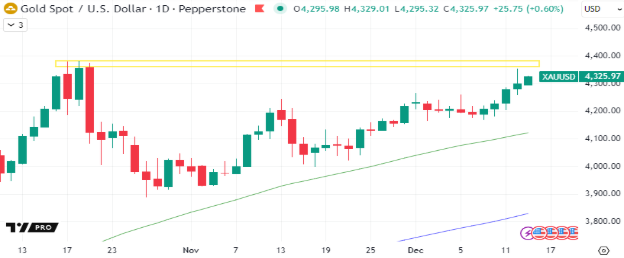 وهنا تبرز المعادن الثمينة كوجهة بديلة. الذهب يعيد اختبار مستويات فنية محورية أعلى من 4,300 دولار للأونصة وسقف السعر التاريخي في وقت متأخر الاسبوع الماضي ، وهي مناطق شكلت مقاومة قوية. الثبات النسبي قرب هذه المستويات ، مدعوم باتجاه صاعد متوسط الأجل متزامن مع ارتفاع الاهتمام من شريحة اوسع من المشترين ، يشير إلى أن الطلب لا يقتصر على المضاربة القصيرة الاجل فقط ، بل يعكس توجه بإعادة الاهتمام بالمعادن في ظل تراجع شهية المخاطرة في الأسهم من اعلى المستويات في الاسبوع المنصرم.