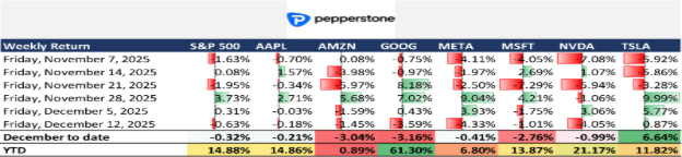 رغم اهمية وثقل هذه البيانات ، فإن سلوك الأسواق خلال الأسابيع الأخيرة يكشف مفارقة واضحة. فعلى مستوى المؤشرات الأميركية ، لم نشهد زخم موسمي يُذكرالى الان. مؤشر S&P 500 سجل أداء سلبي محدود في ديسمبر ، وهو أمر يخالف موسمية ديسمبر. الصورة تصبح أكثر وضوح عند النظر إلى أسهم التكنولوجيا الكبرى ، حيث إن معظم أسهم Mag 7 تتحرك في المنطقة السلبية منذ بداية الشهر ، بما في ذلك أسماء قيادية مثل Apple وAmazon وMicrosoft وNvidia . الاستثناء الوحيد كان Tesla ، التي سجلت مكاسب جيدة، لكن هذا الأداء بقي فردي وغير قادر على تغيير الاتجاه العام أو خلق زخم يمتد الى القطاع.