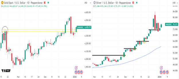 مع بداية اسبوع التداول الاول من العام الجديد، يرتقي الذهب تعاملاته الى مستويات 4400 دولار للاونصة ، محافظ على قدر واضح من التماسك بعد موجة تقلبات شهدها نهاية العام. السعر الحالي يعكس توازن بين عوامل دعم هيكلية مستمرة وضغوط تصحيح قصيرة الاجل. من جهة ، لا يزال الاتجاه العام للذهب مدعوم ببيئة نقدية تميل الى التيسير ، وضعف نسبي في الدولار ، الى جانب استمرار الطلب التحوطي في ظل حالة عدم اليقين الجيوسياسي. ومن جهة اخرى ، فان سرعة الارتفاع السابقة تفرض على السوق فترات من التهدئة واعادة التسعير لان الاسواق لا تسير بخطوط مستقيمة.