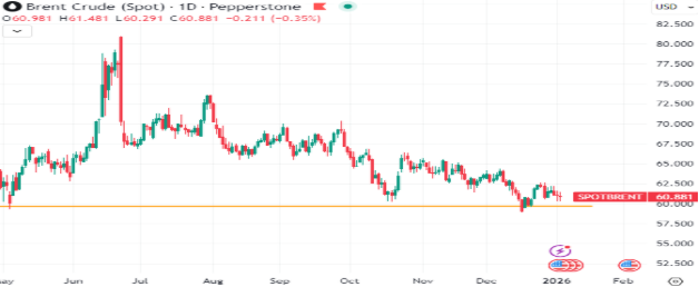 تبدأ اسواق النفط العام الجديد تحت ضغوط واضحة ، حيث يتراجع خام برنت بنحو 0.5% لكنه يحافظ على التداول فوق مستوى 60 دولارا للبرميل ، في حين يتحرك خام غرب تكساس حول مستوى 57 دولار.