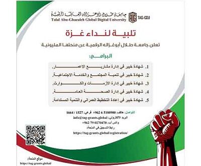 AMMAN – Talal Abu-Ghazaleh Global Digital University (TAG-GDU), a member of Talal Abu-Ghazaleh Global Digital (TAG.GD), continues to receive applications from individuals seeking to enroll in expert qualification programs in the field of reconstruction in areas affected by wars and conflicts, especially the Gaza Strip, which has been subjected to a genocidal war for more than two years.