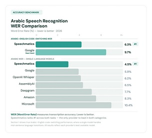 تتصدر Speechmatics كبرى الشركات المُقدمة لخدمات النسخ باللغة العربية فقط، حيث تُحقق معدل خطأ في الكلمات أقل بنسبة 24% من Google (4.5% مقابل 5.9%)، ويتفوق على OpenAI Whisper وAssemblyAI وDeepgram وAmazon وMicrosoft.
