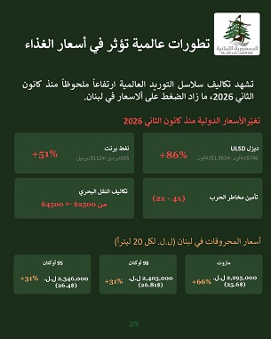 أولاً، التصاعد الملحوظ في التضخم المستورد. فقد ارتفعت أسعار الطاقة عالمياً، لا سيما خام برنت (51%) والديزل (86%)، ما أدى إلى زيادة كلفة الإنتاج المحلي. كما ارتفعت تكاليف الشحن البحري وأقساط التأمين على النقل بشكل كبير نتيجة ارتفاع المخاطر في المنطقة، مما انعكس مباشرة على كلفة الاستيراد.