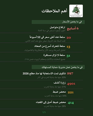 وفي هذا السياق، كثّفت الوزارة عمليات الرقابة الميدانية على مختلف القطاعات الحيوية، ولا سيما في المناطق التي تشهد ضغطاً متزايداً على السلع الأساسية والمناطق التي تستضيف مراكز الإيواء. ومنذ بداية الحرب في 2 آذار ولغاية 27 منه، نفّذت مديرية حماية المستهلك 1,797 زيارة كشف ميدانية، نتج عنها تسطير أكثر من 75 محضر ضبط بمخالفات متنوعة، وأحالت 116 محضراً إلى القضاء المختصّ.