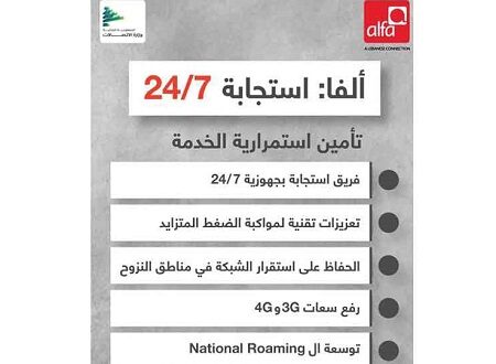 تتعامل شركة ألفا مع المتغيرات والمستجدات على الشبكة في ظل الظروف الاستثنائية القائمة مستندة إلى خطة الإستجابة 24/7، مع التزام تام بتأمين إستمرارية الخدمة للمشتركين بالتنسيق الوثيق مع وزارة الإتصالات.
