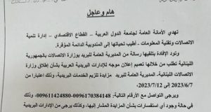 أكمل القراءة »جامعة الدول العربية تعمّم على الإدارات البريدية العربية مزايدة وزارة الاتصالات المتعلقة بالخدمات البريدية
